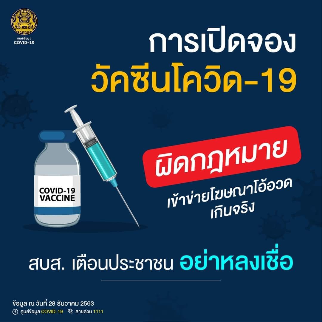 และยังไม่มีการอนุมัติให้สถานพยาบาลใดดำเนินการฉีดวัคซีน โดยการโฆษณาเชิญชวนให้ประชาชนจองวัคซีนโรคโควิด-19