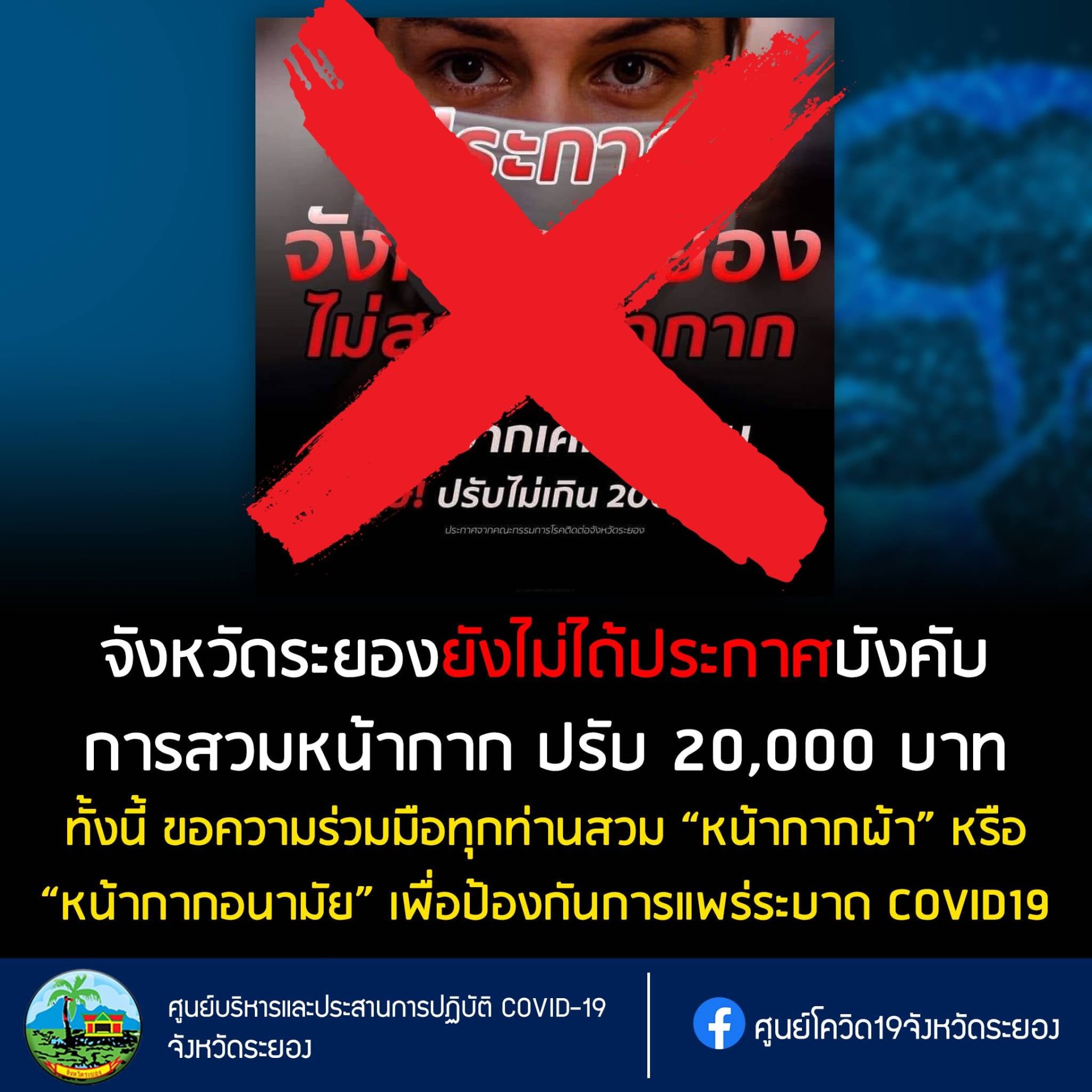 จังหวัดระยองยังไม่ได้ออกประกาศบังคับการสวมหน้ากากผ้าหรือหน้ากากอนามัยนอกเคหะสถาน