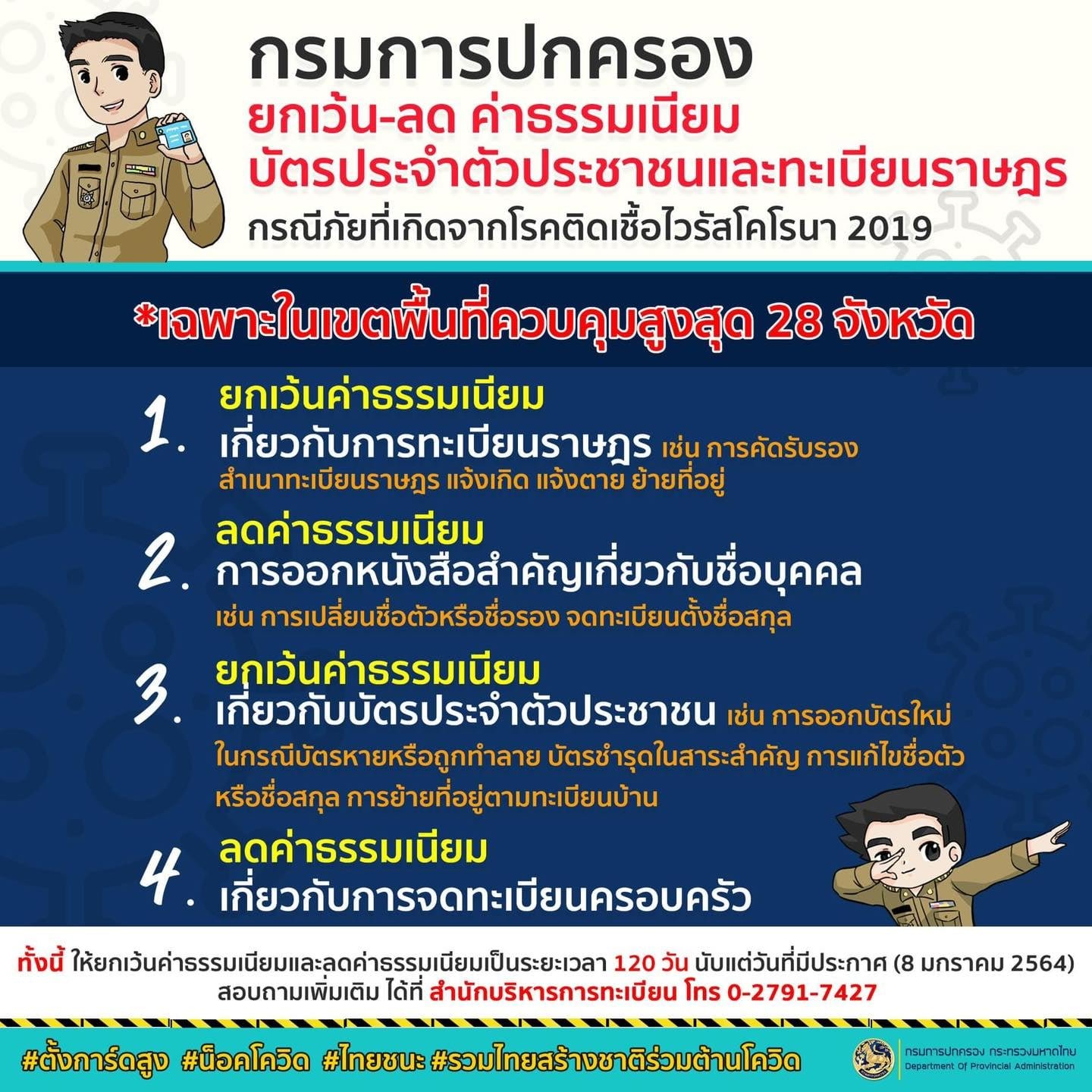 เนื่องจากปัจจุบันพบการแพร่ระบาดของโรคติดเชื้อไวรัสโคโรนา 2019 (COVID - 19) ระลอกใหม่ขึ้นในหลายพื้นที่ โดยมีประกาศพื้นที่ภัยที่เกิดจากโรคติดเชื้อไวรัสโคโรนา 2019 ในเขตพื้นที่ควบคุมสูงสุด 28 จังหวัด ได้แก่ กรุงเทพมหานคร กาญจนบุรี จันทบุรี ฉะเชิงเทรา ชุมพร ชลบุรี ตราด ตาก นครนายก นครปฐม นนทบุรี ปทุมธานี ประจวบคีรีขันธ์ ปราจีนบุรี พระนครศรีอยุธยา เพชรบุรี ราชบุรี ระนอง ระยอง ลพบุรี สิงห์บุรี สมุทรปราการ สมุทรสงคราม สมุทรสาคร สุพรรณบุรี สระแก้ว สระบุรี อ่างทอง ดังนั้นเพื่อเป็นการช่วยเหลือแก้ไขปัญหาความเดือดร้อนและลดภาระค่าใช้จ่ายแก่ประชาชนในสถานการณ์วิกฤตินี้ กรมการปกครองจึงได้ยกเว้นค่าธรรมเนียมและลดค่าธรรมเนียมต่าง ๆ ดังต่อไปนี้