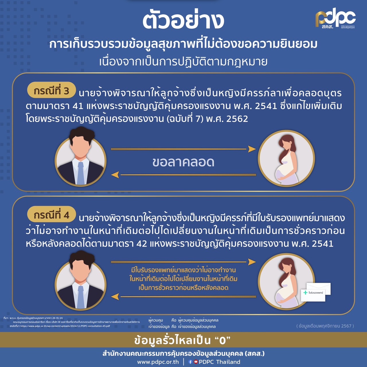 การเก็บรวบรวมข้อมูลส่วนบุคคลเกี่ยวกับข้อมูลสุขภาพเนื่องจากเป็นการจำเป็นในการปฏิบัติตามกฎหมาย เพื่อให้บรรลุวัตถุประสงค์เกี่ยวกับการคุ้มครองแรงงานตามมาตรา 26 (5) (ค) แห่งพระราชบัญญัติคุ้มครองข้อมูลส่วนบุคคล พ.ศ. 2562 เป็นการเก็บรวบรวมข้อมูลส่วนบุคคลที่ได้รับการยกเว้นไม่ต้องขอความยินยอมจากเจ้าของข้อมูล
